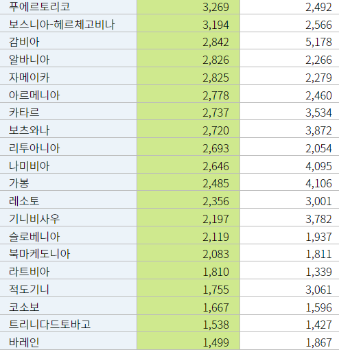 푸에르토리코, 보스니아 헤르체고비나, 감비아, 알바니아, 자메이카, 아르메니아, 카타르, 보츠와나, 리투아니아, 나미비아, 가봉, 레소토, 기니비사우, 슬로베니아, 북마케도니아, 라트비아, 적도기니, 코소보, 트리니다드토바고, 바레인