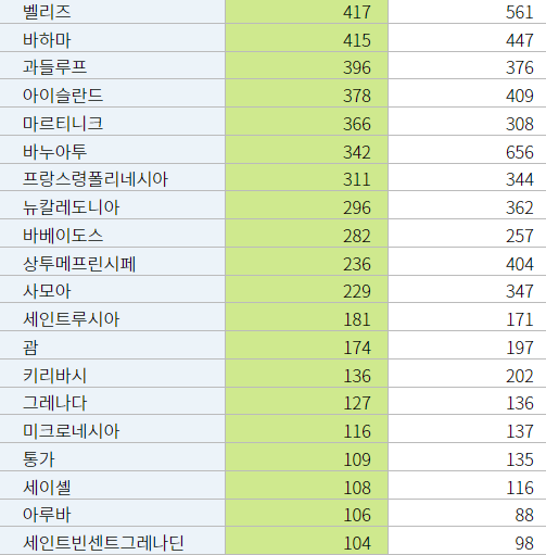벨리즈, 바하마, 과들루프, 아이슬란드, 마르티니크, 바누아투, 프랑스령 폴리네시아, 뉴칼레도니아, 바베이도스, 상투메프린시페, 사모아, 세인트루시아, 괌, 키리바시, 그레나다, 미크로네시아, 통가, 세이셸, 아루바, 세인트빈센트그레나딘