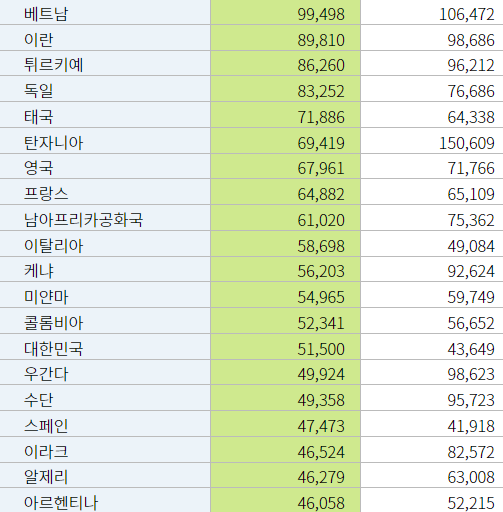 베트남, 이란, 튀르키예, 독일, 태국, 탄자니아, 영국, 프랑스, 남아프리카공화국, 이탈리아, 케냐, 미얀마, 콜롬비아, 대한민국, 우간다, 수단, 스페인 이라크, 알제리, 아르헨티나