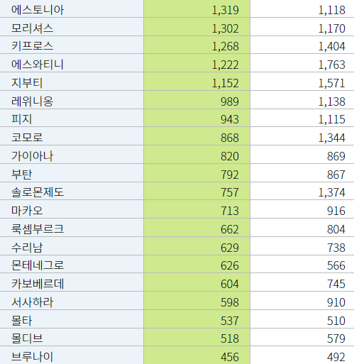 에스토니아, 모리셔스, 키프로스, 에스와티니, 지부티, 레위니옹, 피지, 코모로, 가이아나, 부탄, 솔로몬제도, 마카오, 룩셈부르크, 수리남, 몬테네그로, 카보베르데, 서사하라, 몰타, 몰디브, 브루나이