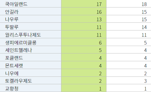 쿡아일랜드, 안길라, 나우루, 투발루, 월리스푸투나제도, 생피에르미클롱, 세인트헬레나, 포클랜드, 몬트세랫, 니우에, 토켈라우제도, 교황청