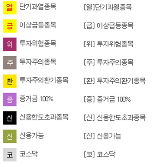 [급] 이상급등종목, [위] 투자위험종목, [주]투자주의종목, [환] 투자주의환기종목, [증] 증거금 100%, [신] 신용한도초과종목, [신] 신용가능, [코] 코스닥