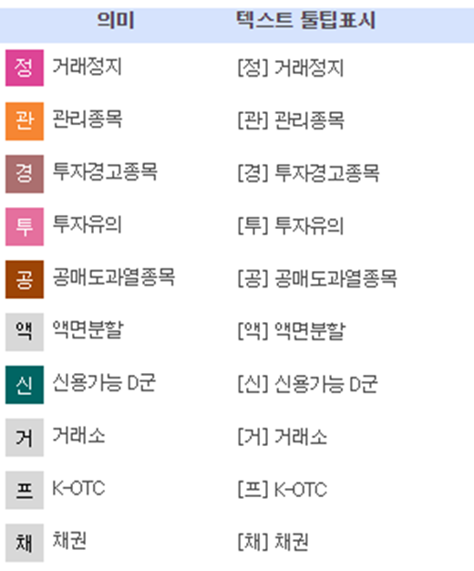 [정] 거래정지, [관] 관리종목, [경] 투자경고종목, [투] 투자유의, [공] 공매도과열종목, [액] 액면분할, [신] 신용가능 D군, [거]거래소, [프] K-OTC, [채] 채권