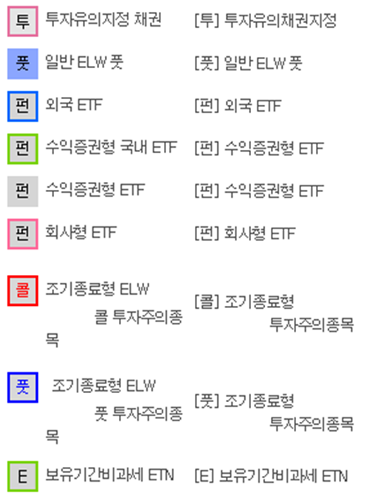 [투] 투자유의채권지정, [풋] 일반 ELW풋, [펀] 외국 ETF, [펀] 수익증권형 ETF, [펀] 회사형 ETF, [콜] 조기종료형 투자주의종목, [E] 보유기간비과세 ETN